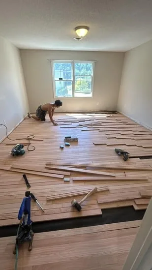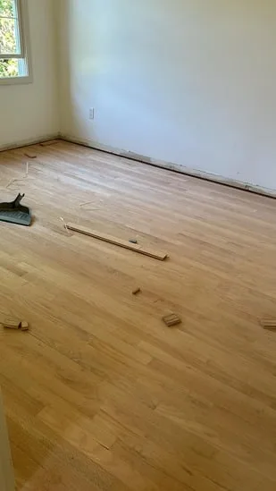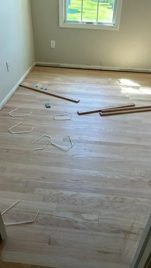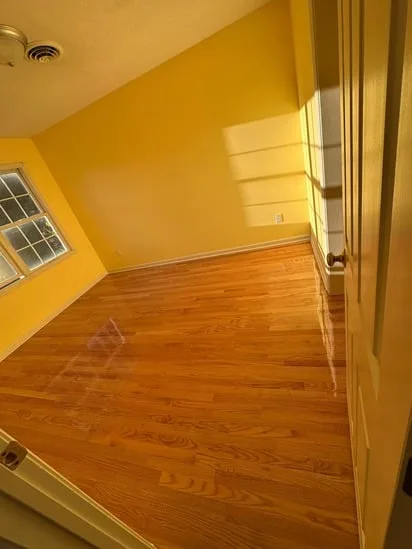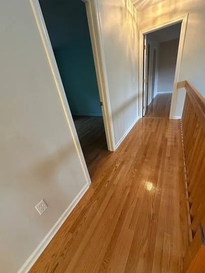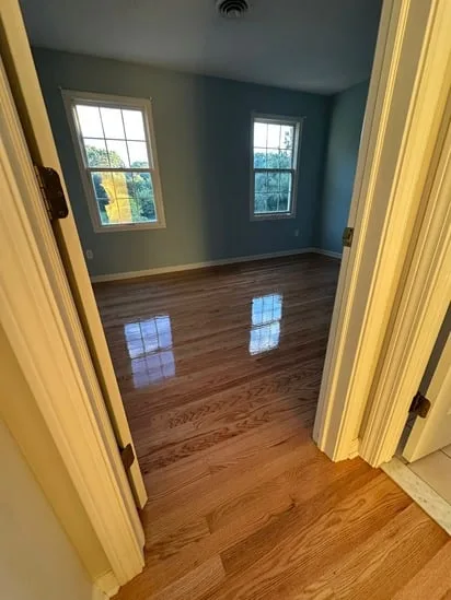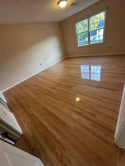 This project began with the careful placement of raw hardwood planks across multiple rooms and hallways. Following the initial layout and securing of the boards, the surface was fully sanded to ensure a completely smooth and even base. Next, a thorough cleaning removed all dust and debris from the workspace. Finally, multiple coats of a high gloss finish were applied to protect the wood and enhance its natural grain patterns. As a result, the rooms were transformed with durable and highly reflective flooring.