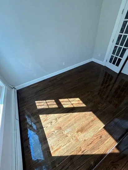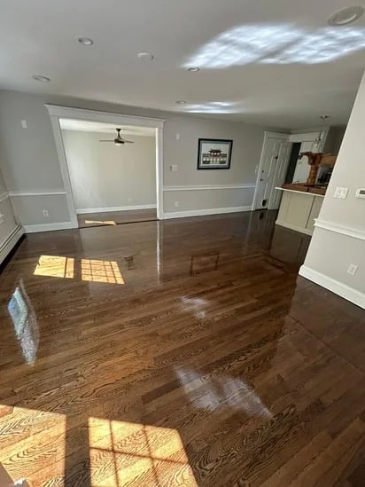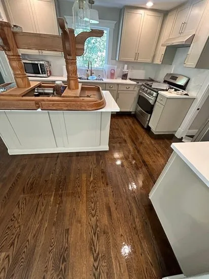 This project began with a comprehensive sanding process to remove the existing wear and prepare the oak surfaces for a fresh application. Consequently, the natural grain of the wood was revealed, allowing for a deep, uniform stain to be applied throughout the living areas and kitchen. Furthermore, the technicians applied multiple layers of a high-gloss finish to ensure long-term durability and a reflective sheen. As a result, the transition between the renovated rooms remains seamless, highlighting the consistent craftsmanship across the entire home layout.